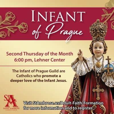 The Infant of Prague Guild are Catholics who promote a deeper love of the Infant Jesus. This is accomplished through the recitation of the Chaplet of the Infant Jesus, teaching school children about the Child Jesus, and preparing small bags for those who are being Baptized.