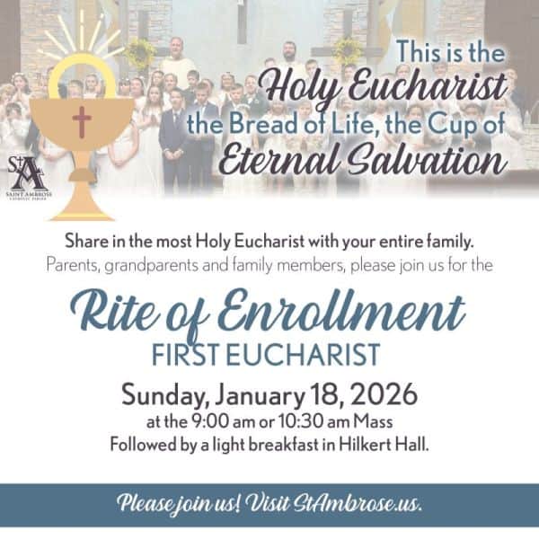 Parents, grandparents and family members, please join us for the Rite of Enrollment for First Eucharist. A light breakfast will follow Mass in Hilkert Hall.