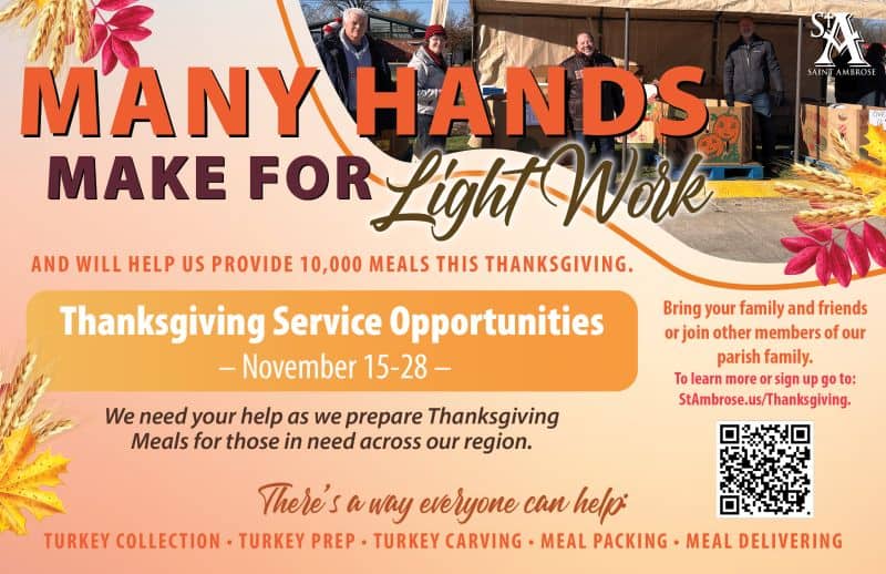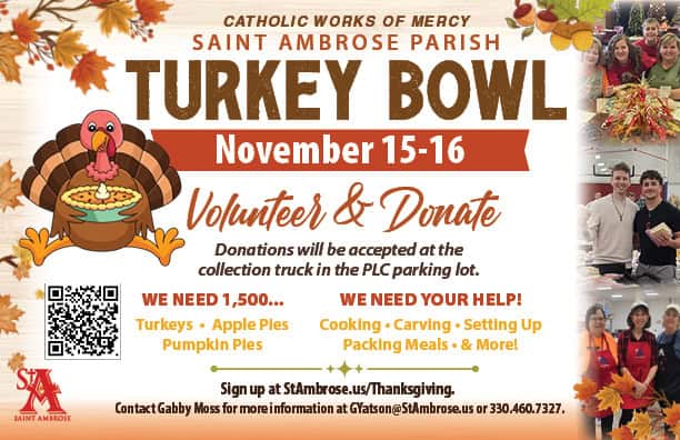 With your help, our parish will be providing 10,000 meals in the greater Akron & Cleveland areas. We need help in the days before and on the day of Thanksgiving. We need help of every kind (cooking, carving, setting up, packing meals, etc). We need YOUR help to make this happen.