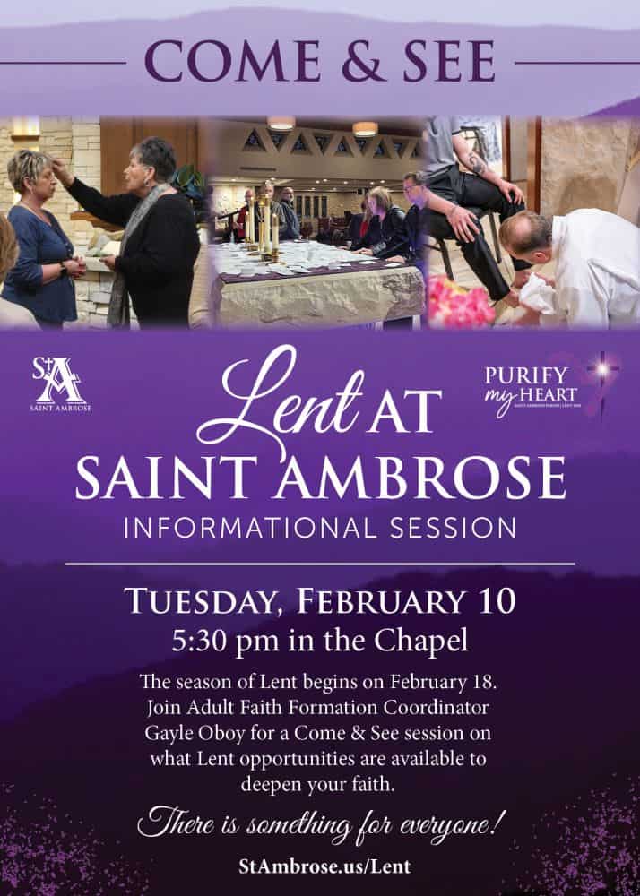 Lent Come & See: Informational Session Tuesday, February 10, 2026 | 5:30 pm in the Chapel Lent begins February 18th. Join Adult Faith Formation Coordinator Gayle Oboy for a Come & See what Lent opportunities are available to deepen your faith. There is something for everyone! https://stambrose.us/wp-content/uploads/2026/01/SA26-Come-See-Lent-Info-Session-600x840.jpg